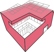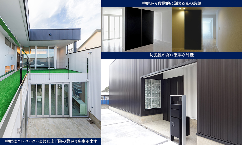 開口を極力限定した建物外壁と閉じつつ開いた中庭外壁
