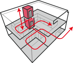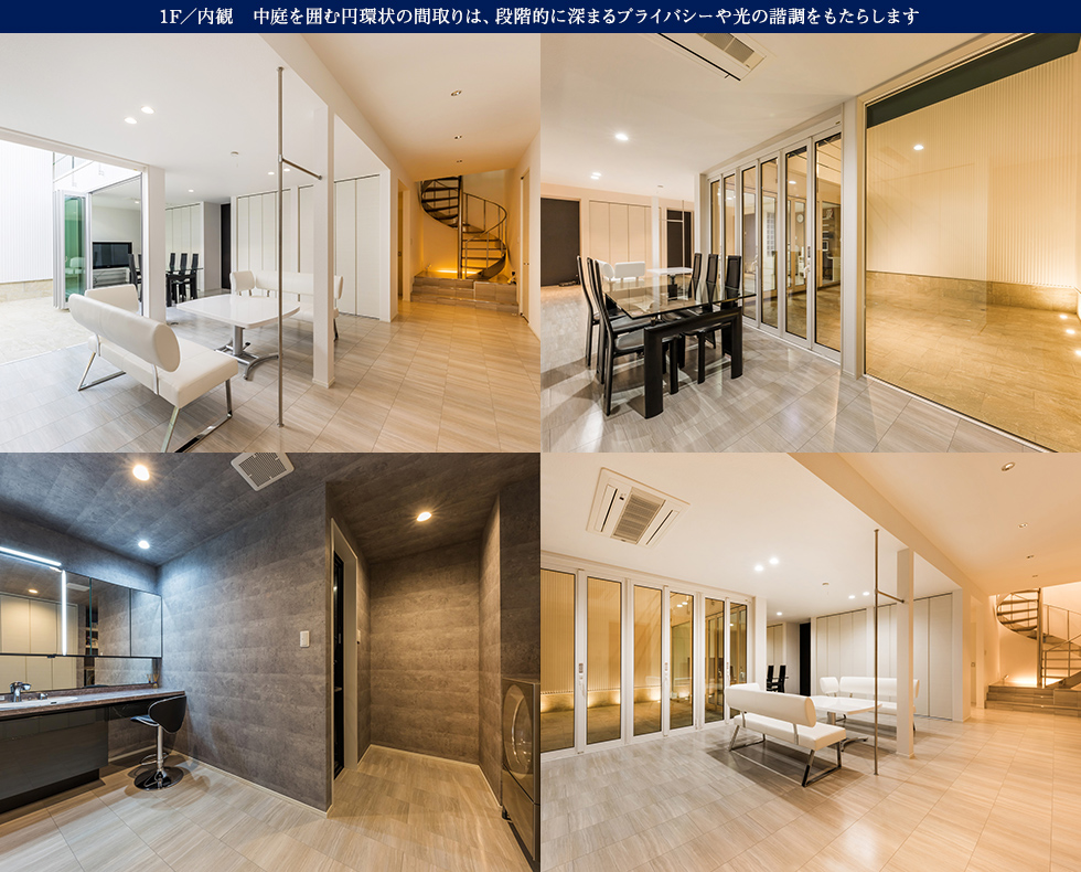 この家の特徴である、空に向かって段状に広がる「中庭」とそれを囲む円環状の構成は、採用した4つの要素から導き出し、設備だけに頼りがちな現代の住宅とは違った、身体的な豊かさを享受できる住まいを目指しました。